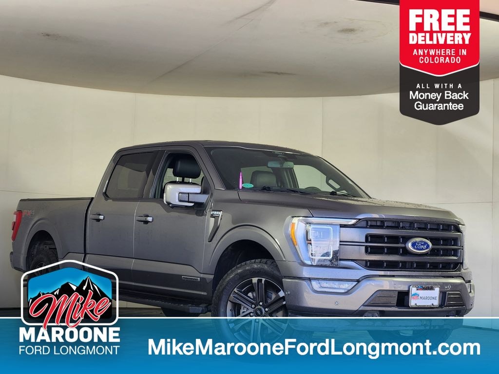 Clean CARFAX. FREE DELIVERY ANYWHERE IN COLORADO, 2022 Ford F-150 Lariat 4x4 SuperCrew, 3.5L PowerBoost Full Hybrid V6 Engine, 10-Speed Automatic Transmission, 4WD, Carbonized Gray Metallic Exterior, Black Leather-Trimmed Bucket Seats, Equipment Group 502A (Lariat High), 12-Inch Productivity Screen, SYNC 4 w/ 12-Inch Touchscreen, Ford Co-Pilot360 Active 2.0, BlueCruise (Hands-Free Driving), Adaptive Cruise Control w/ Stop & Go, Lane Centering, Evasive Steering Assist, Blind Spot Information System w/ Cross-Traffic Alert, Pre-Collision Assist w/ Automatic Emergency Braking, 360-Degree Camera Package, Intelligent Access w/ Push Button Start, Remote Start System, Heated & Ventilated Front Seats, Heated Rear Seats, Heated Steering Wheel, Dual-Zone Automatic Climate Control, B&O Sound System by Bang & Olufsen (8 Speakers), Wireless Charging Pad, Pro Trailer Backup Assist, Integrated Trailer Brake Controller, Max Trailer Tow Package, FX4 Off-Road Package, Skid Plates, Electronic Locking Rear Axle (3.73 Ratio), 20-Inch Six-Spoke Dark Alloy Wheels, 275/60R20 All-Terrain Tires, Bed Utility Package, Power Tailgate, Tailgate Step, BoxLink System, LED Box Lighting, Tough Bed Spray-In Bedliner, Twin Panel Moonroof, Liner Tray Style Floor Mats, 50-State Emissions. Odometer is 28215 miles below market average! Gray Metallic 2022 Ford F-150 Lariat 4D SuperCrew 3.5L PowerBoost Full-Hybrid V6 10-Speed Automatic 4WD