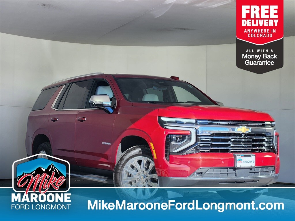 Recent Arrival! Clean CARFAX. CARFAX One-Owner. FREE DELIVERY ANYWHERE IN COLORADO, 4WD, Premier Trim, 5.3L EcoTec3 V8 Engine, 10-Speed Automatic Transmission, Mechanical Limited-Slip Differential, Magnetic Ride Control, Adaptive Cruise Control, Electronic Precision Shift, Trailer Package, Trailer Brake Controller, StabiliTrak Electronic Stability Control, HD Surround Vision Camera, Rear Camera Mirror, Enhanced Automatic Parking Assist, Front Pedestrian and Cyclist Braking, Forward Collision Alert, Rear Cross Traffic Braking, Rear Pedestrian Alert, Blind Zone Steering Assist with Trailering, Lane Keep Assist with Lane Departure Warning, Safety Alert Seat, IntelliBeam Automatic High Beams, Theft Deterrent System, Enhanced Security Package (Glass Break Sensor, Interior Movement Sensor), Perforated Leather Seating, Heated and Ventilated Front Seats, Heated Second Row Bucket Seats, Power-Release Second Row, Power-Folding Third Row Seat, Tri-Zone Automatic Climate Control, Memory Settings for Driver Seat/Mirrors/Steering Column, Heated Leather-Wrapped Steering Wheel, Wireless Charging Pad, Power Panoramic Sunroof, Rear Seat Media System (Dual 12.6" Displays), Bose Premium Audio System, 17.7" Diagonal Infotainment Display, Google Built-In with Navigation Capability, Wireless Apple CarPlay, Wireless Android Auto, SiriusXM Capability, OnStar Services, Keyless Open and Start, Remote Start, Power Liftgate, AutoSense Hands-Free Power Liftgate, LED Headlamps and Taillamps, Animated Exterior Lighting, LED Daytime Running Lights, LED Fog Lamps, Power-Folding Heated Mirrors with Turn Signals, Dual Exhaust with Dual Tips, 20" Polished Aluminum Wheels, Power Retractable Assist Steps, Roof Rails, Heated Rear Window, Radiant Red Tintcoat Exterior, Jet Black / Sky Cool Gray Interior, This 2025 Chevrolet Tahoe Premier 4WD delivers full-size luxury, advanced technology, and powerful V8 performance in a highly capable SUV. Equipped with Magnetic Ride Control, HD surround cameras, advanced driver-assist features, and a premium leather interior, it offers both confidence and comfort in every drive. With a panoramic sunroof, rear-seat entertainment, wireless smartphone integration, and strong trailering capability, this Tahoe is an exceptional choice for families who want space, sophistication, and capability in one premium package.. Odometer is 2074 miles below market average! Radiant Red Tintcoat 2025 Chevrolet Tahoe Premier 4D Sport Utility EcoTec3 5.3L V8 10-Speed Automatic with Overdrive 4WD