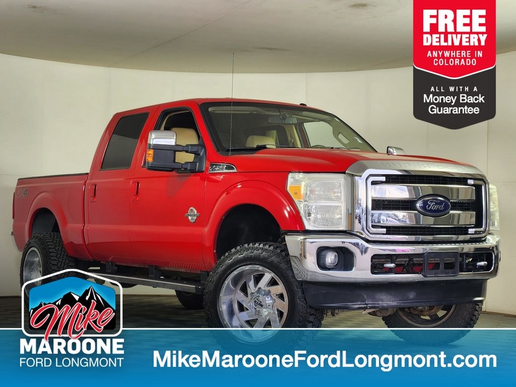 FREE DELIVERY ANYWHERE IN COLORADO, 2012 Ford F-250 Super Duty Lariat 4x4 Crew Cab, 6.7L Power Stroke V8 Turbo Diesel Engine, 6-Speed Automatic Transmission, Vermillion Red Exterior, Adobe Leather Interior, Four-Wheel Drive, Preferred Equipment Package 608A (Lariat), FX4 Off-Road Package, Electronic Locking Rear Axle (3.55 Ratio), Chrome Package w/ Cab Steps, 20" Chrome Clad Aluminum Wheels, PowerScope Trailer Tow Mirrors, Trailer Brake Controller, Trailer Tow Package, Upfitter Switches, Skid Plates, Engine Block Heater, 10000 lb GVWR Package, Tailgate Step, Remote Start System, Rear View Camera, Universal Garage Door Opener, Power Sliding Rear Window, Power Adjustable Pedals, Dual-Zone Electronic Climate Control, Heated & Cooled Front Seats, 10-Way Power Driver & Passenger Seats, Premium Audio System w/ SiriusXM, SYNC Voice-Activated System, Leather-Wrapped Steering Wheel w/ Audio Controls, Reverse Sensing System, Keyless Entry Keypad, Integrated Tow Hooks, Locking Tailgate, Privacy Glass, Spare Tire & Wheel. Vermillion Red 2012 Ford F-250SD Lariat 4D Crew Cab Power Stroke 6.7L V8 DI 32V OHV Turbodiesel TorqShift 6-Speed Automatic with Overdrive 4WD