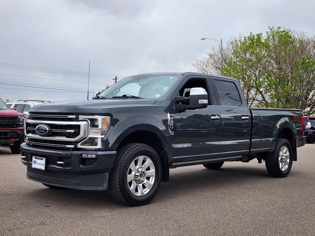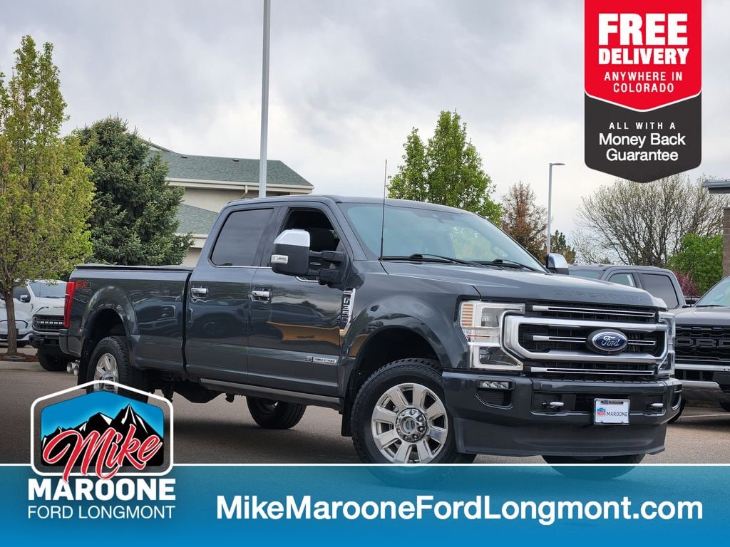 CARFAX One-Owner. FREE DELIVERY ANYWHERE IN COLORADO, 2024 Ford F-350 Super Duty Platinum 4x4 Crew Cab, 6.7L Power Stroke V8 Turbo Diesel, 10-Speed Automatic Transmission, 176" Wheelbase, Lithium Gray Exterior, Black Leather Interior, 4WD, Preferred Equipment Package 713A, FX4 Off-Road Package, 3.55 Electronic Locking Rear Axle, Power Running Boards, Twin Panel Moonroof, 5th Wheel / Gooseneck Prep Package, Skid Plates, Engine Block Heater, Rapid-Heat Supplemental Heater, Upfitter Switches, Wheel Well Liners (Front & Rear), 397 Amp Alternator, Adaptive Cruise Control, BLIS w/ Cross-Traffic Alert, Pre-Collision Assist w/ AEB, Lane-Keeping Alert, Reverse Sensing System, 360-Degree Camera, LED Reflector Headlamps & Fog Lamps, PowerScope Trailer Tow Mirrors (Power Fold/Extend/Heat), Power Tailgate, Remote Tailgate Release, Trailer Brake Controller, Tow Hooks (Chrome), Rain-Sensing Wipers, SYNC 3 w/ 8" Touchscreen, FordPass Connect w/ 4G WiFi Hotspot, B&O Sound System (10 Speakers), Navigation System, Wireless Charging Pad, Dual-Zone Electronic Automatic Climate Control, Heated & Ventilated Front Seats, Heated Steering Wheel, 10-Way Power Driver & Passenger Seats, Power Adjustable Pedals w/ Memory, Ambient Lighting, 110V/400W Outlet, Remote Keyless Entry, Push-Button Start, AdvanceTrac w/ RSC, Trailer Sway Control, Tire Pressure Monitoring System (TPMS).. Lithium Gray Metallic 2021 Ford F-350SD Platinum 4D Crew Cab Power Stroke 6.7L V8 DI 32V OHV Turbodiesel 10-Speed Automatic 4WD