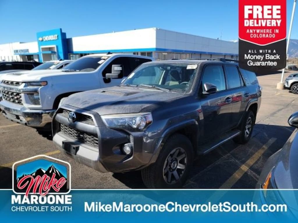 COME SEE THIS BEAUTIFUL 2017 Toyota 4Runner TRD Off-Road AT MIKE MAROONE CHEVROLET SOUTH 230 N ACADEMY BLVD COLORADO SPRINGS CO, 3 DAY 150 MILE MONEY BACK GUARANTEE**, FREE DELIVERY ANYWHERE IN COLORADO**, 60 DAY POWERTRAIN WARRANTY**, 4 WHEEL DRIVE**, AIR CONDITIONING**, ALLOY WHEELS**, FRESH OIL & FILTER CHANGE**, CRUISE CONTROL**, POWER WINDOWS**, POWER LOCKS**, POWER SEAT**, REAR BACK UP CAMERA**. 4WD Certification Program Details: This 2017 Toyota 4Runner TRD Off-Road also comes with the FULL Mike Maroone 60-Day warranty. We will review the technician's vehicle inspection report with you before purchase. Our intention is to provide you a completely transparent buying experience. At Mike Maroone our used vehicles are Safety Checked, Warrantied, CARFAX, and if you don't like it ... Bring it back! All of our new and used vehicles come with the Mike Maroone Preferred Owner Advantages listed below: - MARKET BASED PRICING - 3 DAY/150 MILE MONEY BACK GUARANTEE - FREE LOANERS FOR SERVICE GUESTS WHO SET AN ONLINE APPOINTMENT - 12 MONTH/12K MILE SERVICE/COLLISION GUARANTEE - 60 DAY LIMITED POWERTRAIN PRE-OWNED VEHICLE WARRANTY - MILITARY DEPLOYMENT BUYBACK GUARANTEE - FREE DELIVERY ANYWHERE IN COLORADO For more information or vehicles like it, stop by Mike Maroone South today. We are just south of the Citadel Mall on the corner of Academy and Bijou.